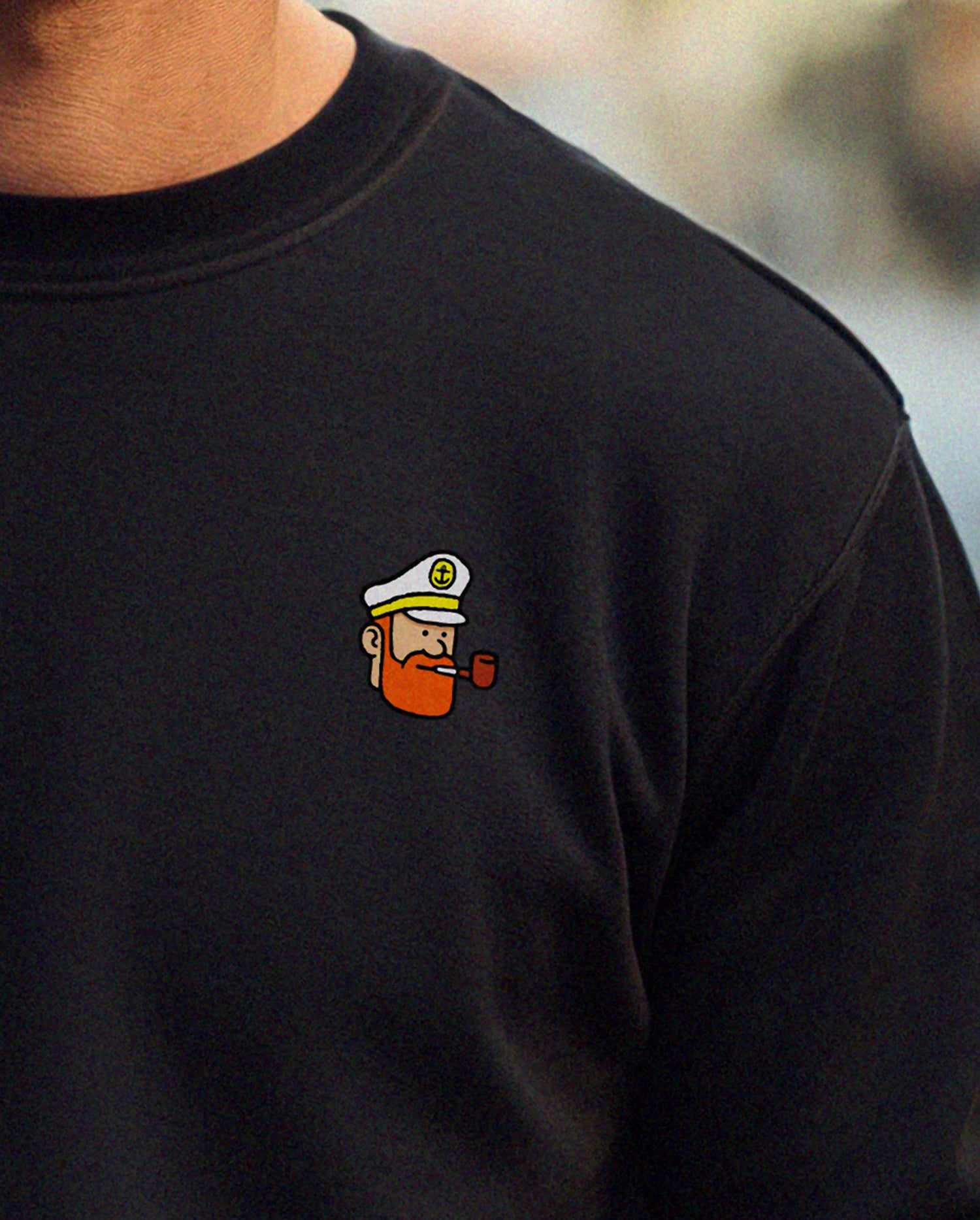 No fuss. Just a black heavyweight sweatshirt with attitude printed on. A clean cut, bold enough to stand on its own — minimal on the outside, maxed on character. The Captain’s face printed on the chest, because legends deserve their spot.